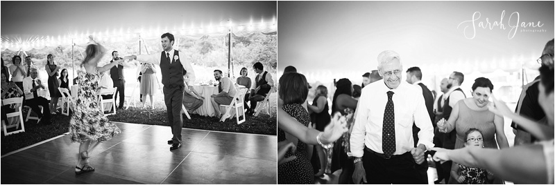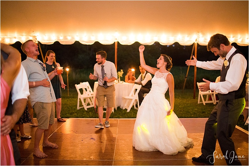No rain came until it was time to be introduced into the reception… As in the very moment that the The Music Man DJ said “…and here comes the bride and groom….!” and the skies opened and they dashed across the lawn of Emmons Preserve into their reception tent. It was crazy. They then hopped right into their first dance, sopping wet, and surprised everyone with the most fun and energetic choreographed dance I have ever seen!