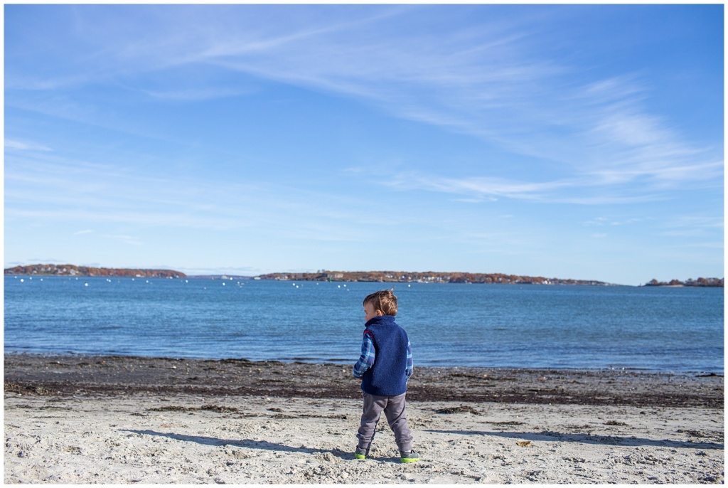 The P Family opted for a family photo session in South Portland which is near where they reside. I immediately thought of Willard Beach and the yellows were out in full force. The leaves were still changing, despite the late season, and the moss on the stone walls was a vibrant gold color. It complimented their muted shades of greys and blues with an extra pop. After we were done on the hill, we trekked back down to the beach where we admired the water and played on the playground for a bit before lunch time was upon us (and nap-time was nearing).